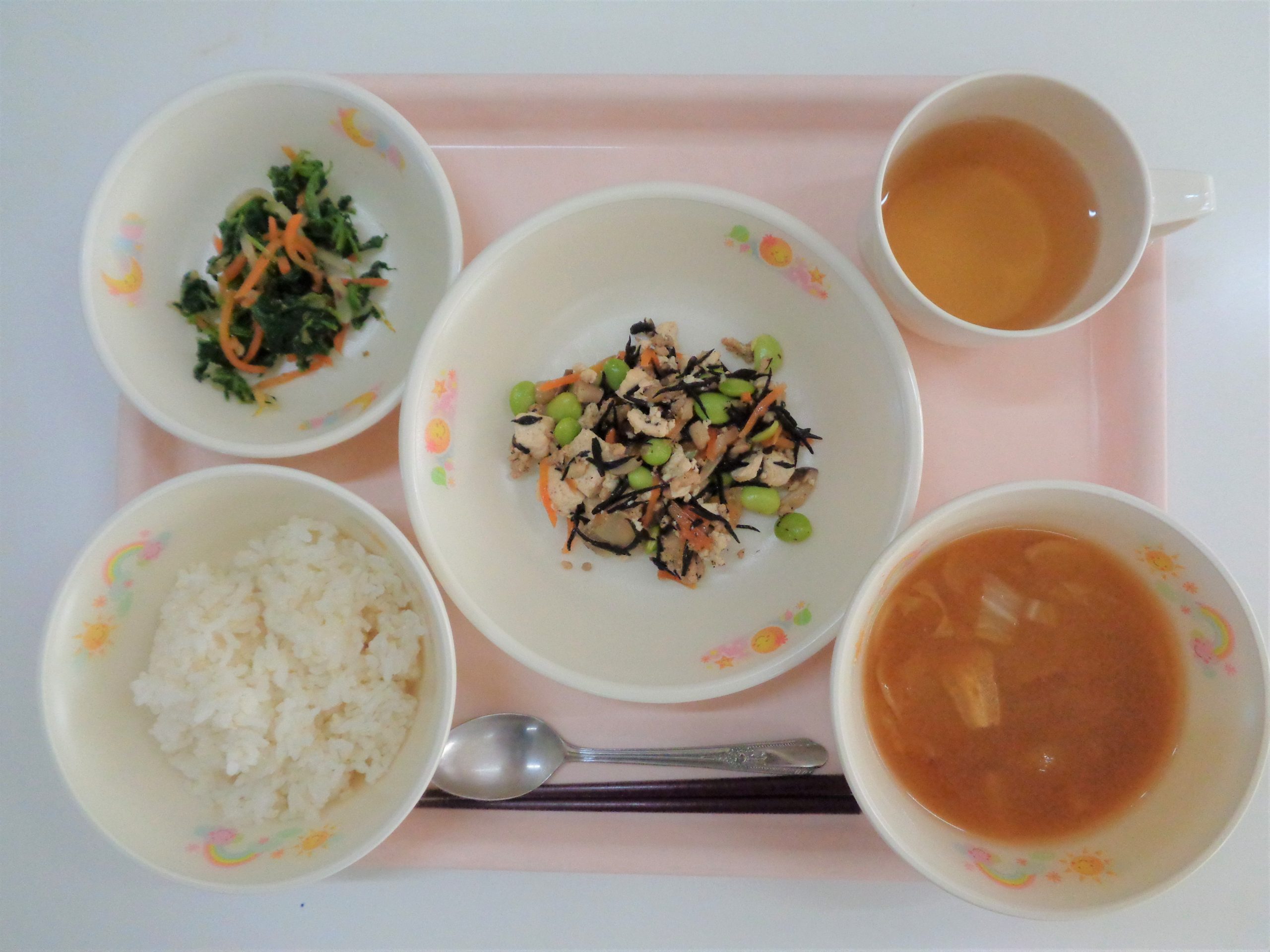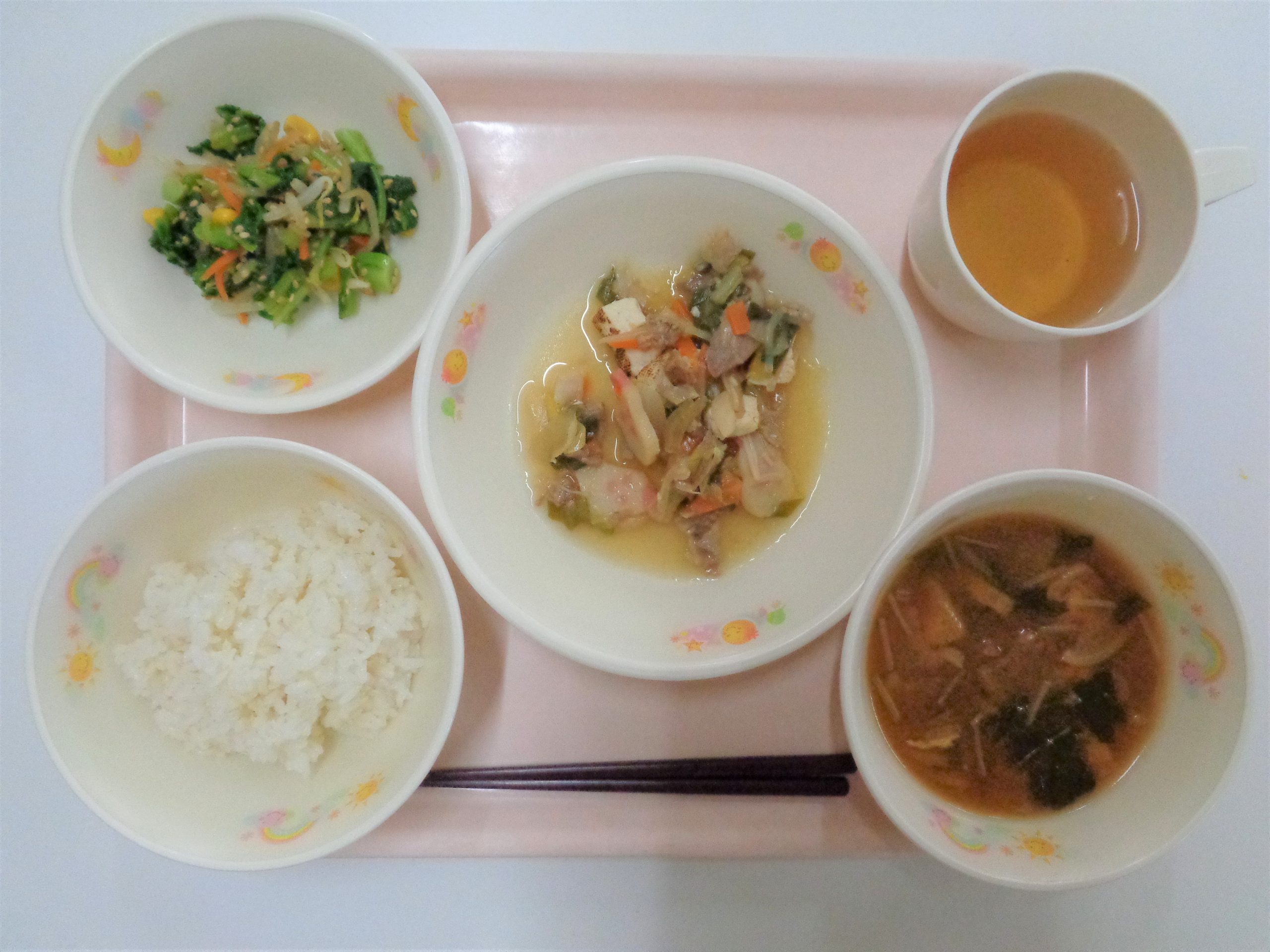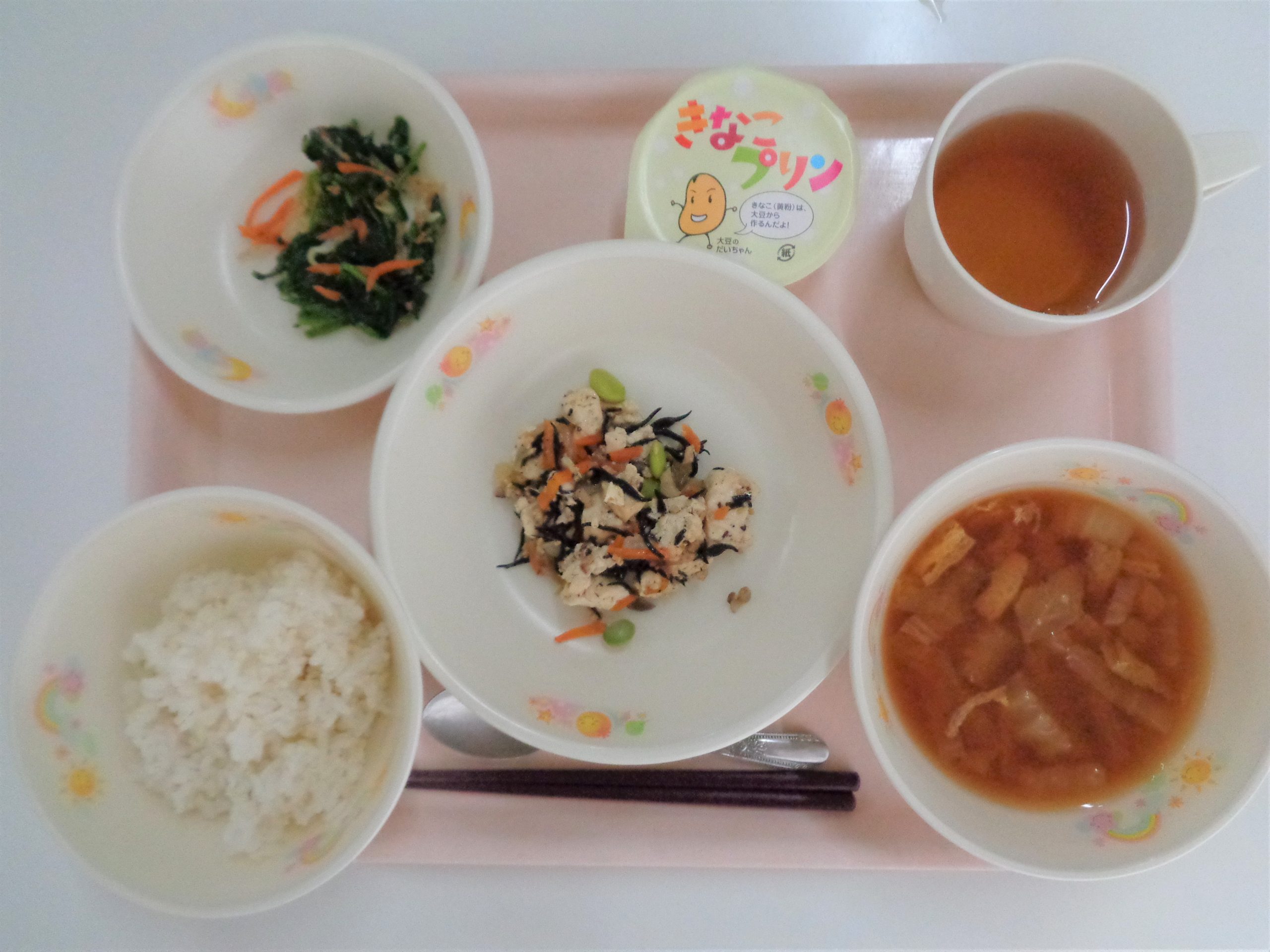 *きくいもと小松菜のみそ汁には、町内産の菊芋が使われています。